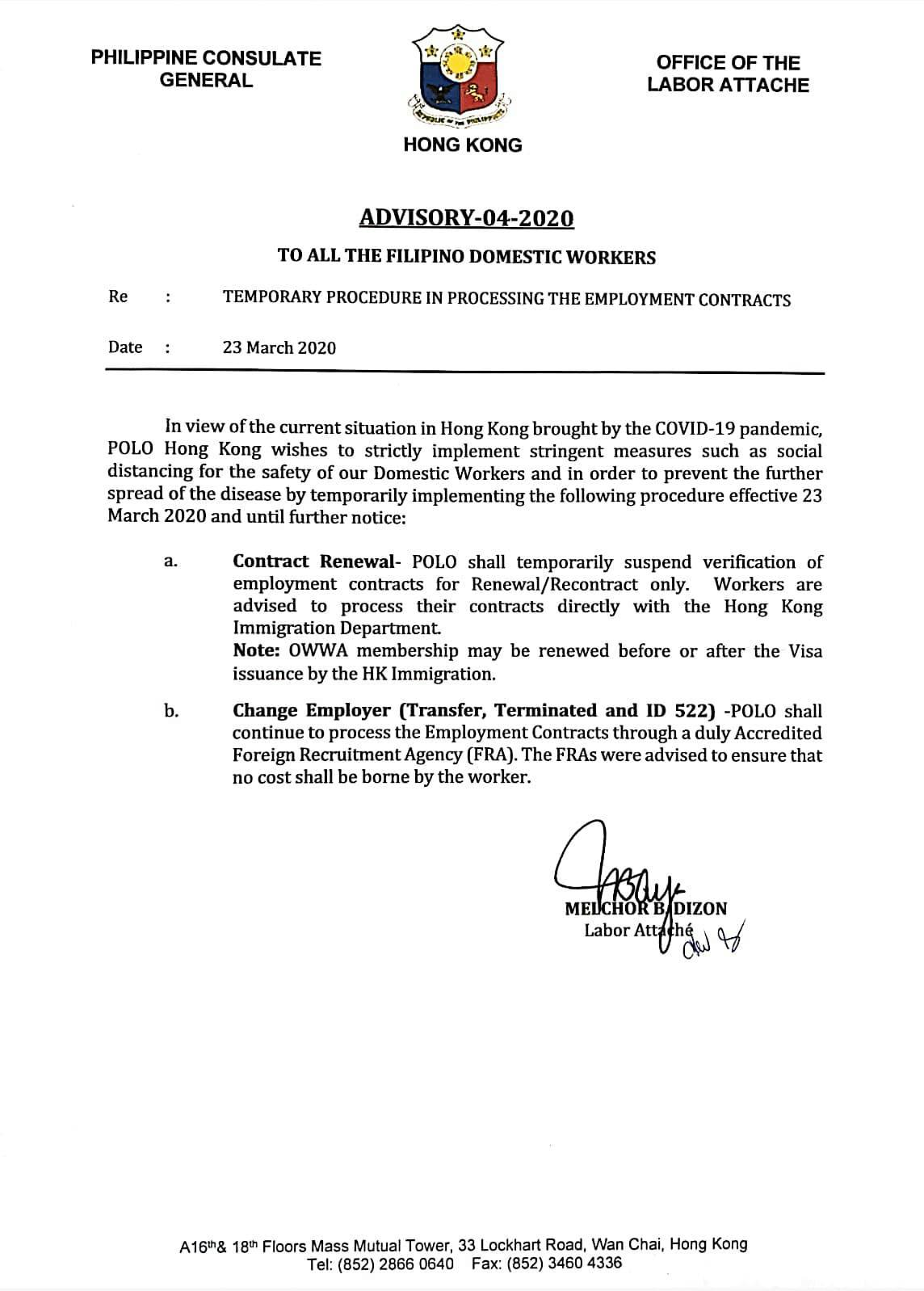 Notarization of employment contracts is suspended for first-time domestic helpers. As the Hong Kong Immigration Department requires the employment contract of first-time Filipino domestic workers to be notarised by POLO, the employment of these first-time is not available at the moment.